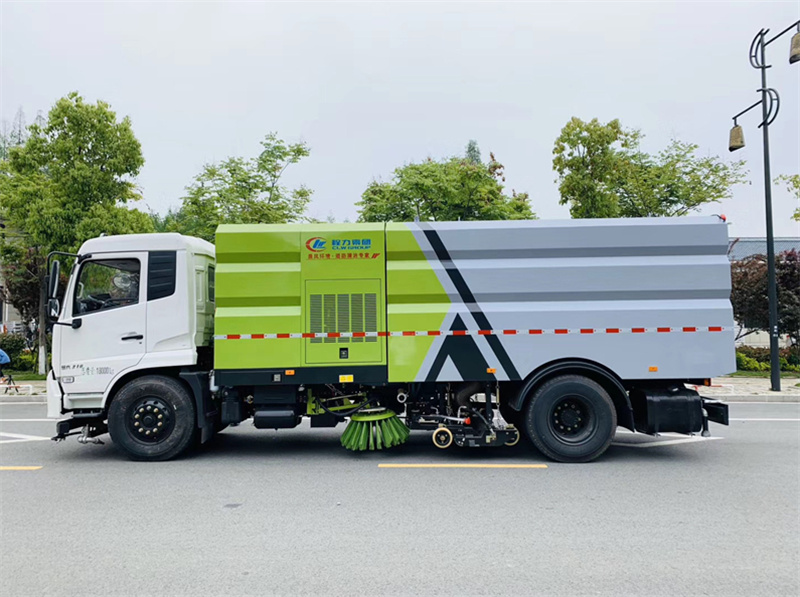 1)该车集扫路车、洒水车和高压清洗车功能于一体,具备路面清扫、路面洗刷、高压清洗、低压冲洗、路缘石洗刷、垃圾收集、污水回收、喷雾降尘和道路隔离墙清洗、小广告清洗等多种作业功能。