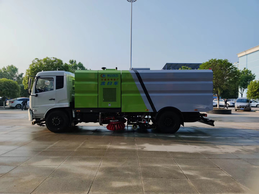 东风天锦洗扫车,白色前翻驾驶室,(5000轴距),国六康明斯210马力,方向助力,275真空胎,带排气制动,上装装副发动机康明斯180马力、风机、高压水泵、清水箱9立方、垃圾箱7立方、左右立扫、带喷水杆的宽吸嘴、低压冲洗系统、垃圾箱自洁,扫盘降尘系统,液压系统、专用装置电控系统和副车架等改装而成。