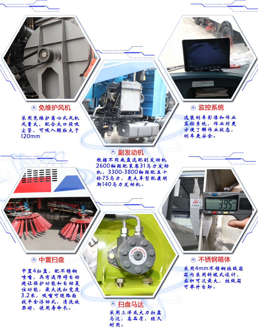 此车为道路洗扫专用车辆,专用装置为扫刷.防护装置均采用Q235A材质,均采用焊接连接, 专用装置扫刷代替部分侧面防护,扫刷离地高为(mm):180,后下部防护与车架焊接连接, 后下部防护尺寸:50×150(mm),离地面高度420mm. ABS系统型号为XH-KQ4S4M-E01, 生产企业为广州市西合汽车电子装备有限公司;型号为CM4XL-4S/4M, 生产企业为广州瑞立科密汽车电子股份有限公司.整车长/轴距对应关系为(mm):7590/4200,7890/4500, 8090/4700,8590/5200,8990/5600,4700/8310,5200/8680.选装不同的外观图片.随底盘选装驾驶室. |