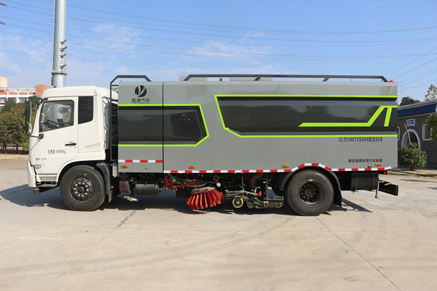 1.CLT5180TXSD6型洗扫车适用于城市道路、高速公路、广场、机场、码头、遂道、桥梁、隔离墙避、路缘和路缘石立面的机械化清洗、清扫、喷雾降尘等清洁作业。具有路面清洗、路面清扫、路缘清洗、路缘和路缘石立面洗刷、低压冲洗、喷雾除尘等多功能。有“全洗扫”、 “右洗扫”、 “全扫”、 “右扫”4种作业模式可选择。选择“全洗扫”模式清洗广场和路面,清洗效率高效果好,洗净率达90%以上。选择“左洗扫”或“右洗扫”模式清洗路面和路缘、洗刷路缘石立面。需要进行路面清扫或路面保洁作业时,可选择扫路模式。需要喷雾除尘时,可开启喷雾装置,进行喷雾除尘作业。可以像洒水车一样对路面进行低压冲洗作业。