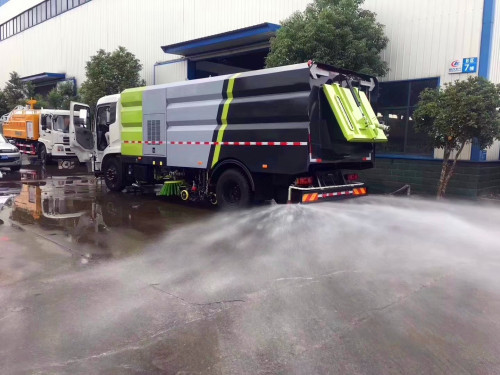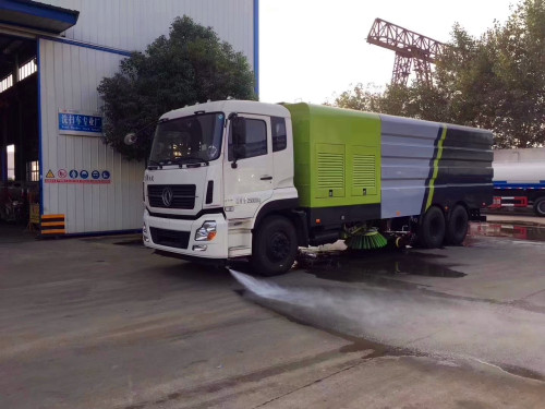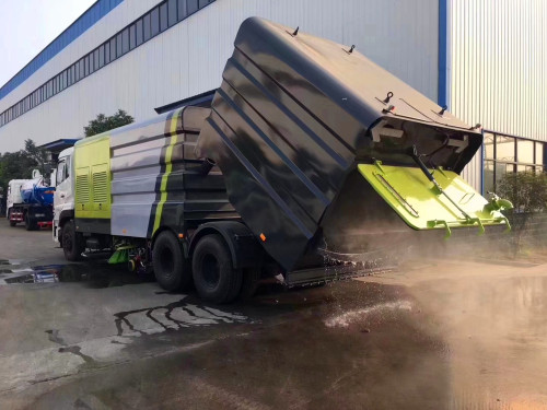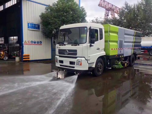 该洗扫车采用东风天龙二类底盘改装,加装副发动机、风机、清水箱、垃圾箱、左右立扫、扫盘降尘系统、左右高压侧喷高、吸盘内置高压主喷杆、气动系统、液压系统、专用装置电控系统和副车架等改装而成,