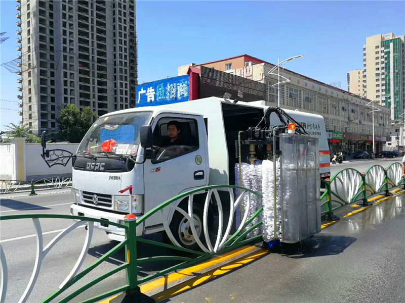 城市道路隔离护栏专用车:是采用毛刷擦洗和高压水冲洗相结合的作业方式,进行清洗城市道路隔离护栏的,中置四根高压喷杆,喷出水压高达24兆帕,能轻松解决护栏上面的粘浮垃圾及灰尘泥土,四根立式滚刷(尼农条和粘连布组合材质)夹紧护栏高速转动,将护栏上的顽固污渍、油渍轻松擦除,其中前置两排高压喷杆进行第一次高压冲洗,然后四根立式滚刷进行两次强力擦洗,最后后置两根高压喷杆进行二次冲洗,清洗过后护栏洁净如新。
