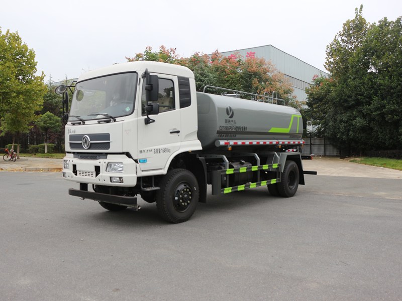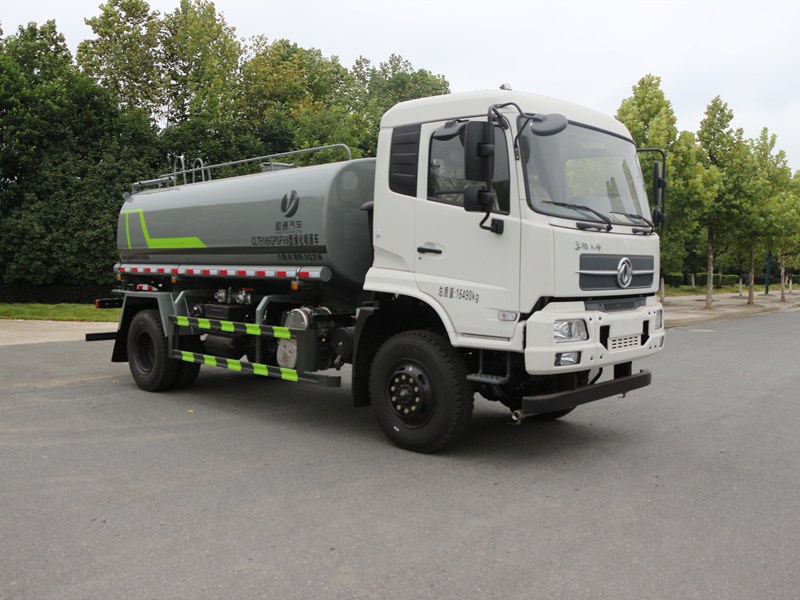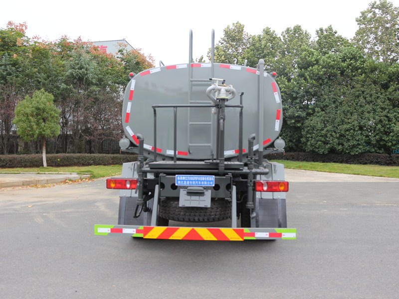东风天锦4驱洒水车专用功能配置:罐体实际容积约为11立方米,(罐体有效参数9立方米、额定载质量8575kg、)采用武钢优质碳钢板卷压成型。配备专用洒水泵,自吸自排,前喷后洒、侧喷、后工作平台及洒水高压炮。洒水泵自吸高度为6米左右,整车洒水宽度14米左右,后工作平台水炮可调成:直冲状、大雨、中雨、小雨、毛毛雨,有效射程≥28米,整车带接头、水位计,自流阀。后工作平台主管路带1寸浇花接口,附送2根3米水管,1个爬梯,两侧及后保险杠。