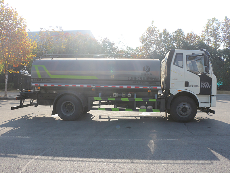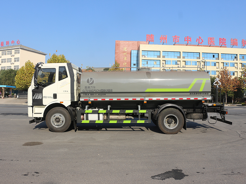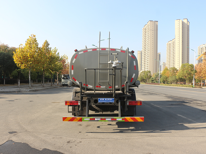 标准配置洒水车主要装备有:前冲(冲洗公路路面)、后洒(公路路面养护)、侧喷、高位侧花洒(路边绿化带优化);后工作平台高压水炮,可调节成柱状,射程≥28m;也可调节成雾状,射程≥30米,水泵自吸高度:≤7m,洒水宽度:≥15m。侧防护网,自流阀,消防接头。洒水车水泵为常压水泵,功能可以抽水、排水。另外根据用户要求,可加消防泵、喷雾机、农药卷盘、农药柱塞泵。罐内可以做防腐防锈、电磁阀气动阀自动放水等****,以满足不同用户需求。