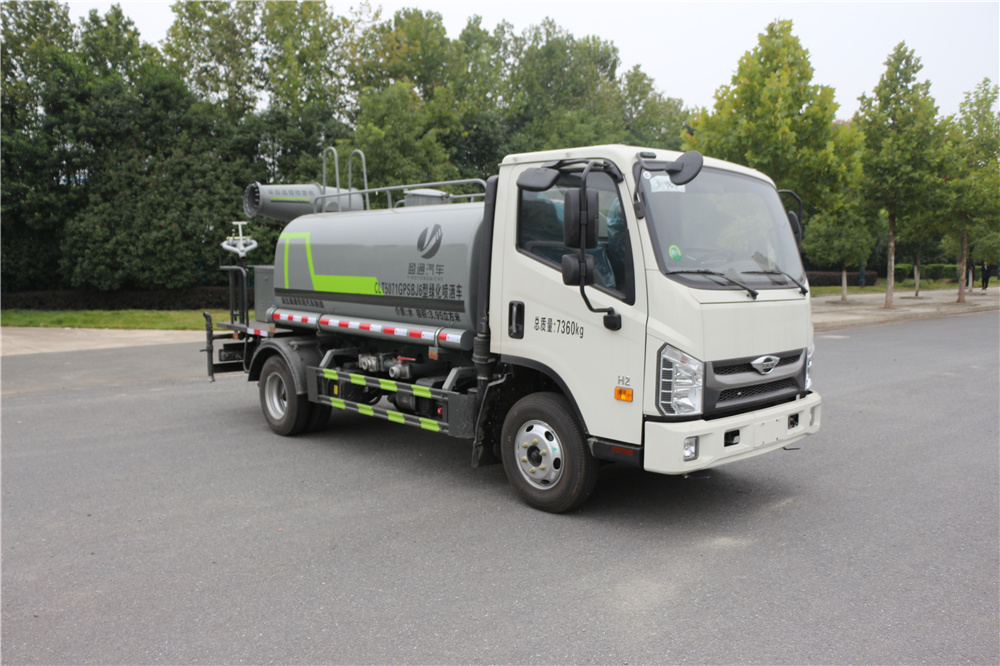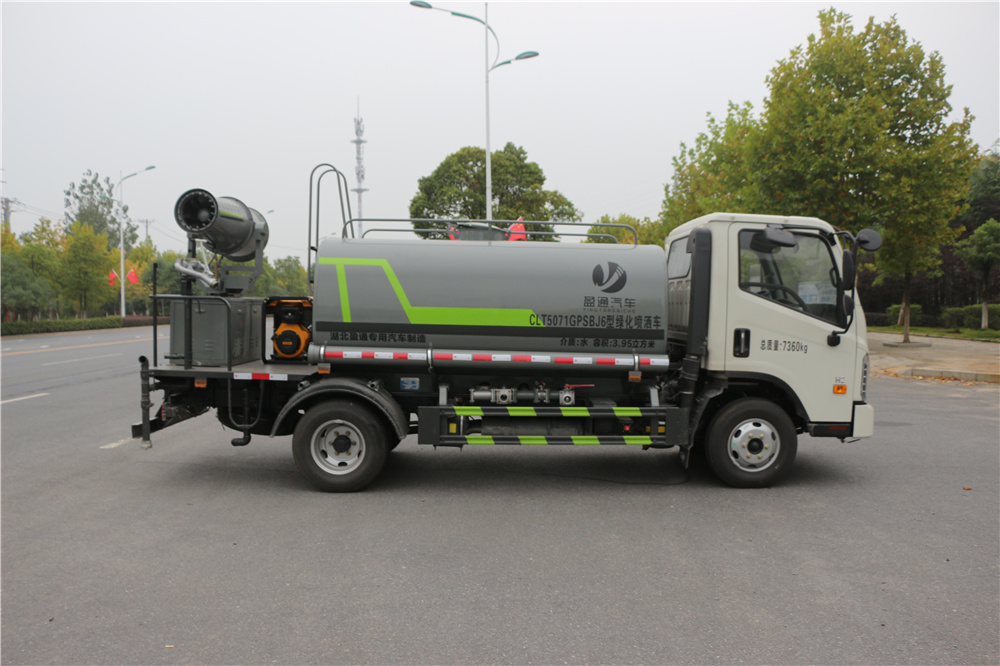 专用功能配置:罐体实际容积为5立方米,采用武钢优质碳钢板卷压成型。配备专用洒水泵,自吸自排,前喷后洒、侧喷、后工作平台及洒水高压炮。洒水泵自吸高度为6米左右,整车洒水宽度14米左右,后工作平台水炮可调成:直冲状、大雨、中雨、小雨、毛毛雨,有效射程≥28米,整车带接头、水位计,自流阀及自吸功能。后工作平台主管道带1寸浇花接口,附送2根3米水管,1个爬梯,两侧及后保险杠。