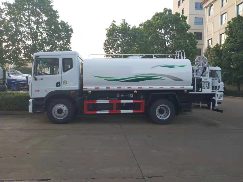 东风洒水车底盘,选装驾驶室;侧喷为选装件;品名:水;密度:1000千克/立方米;有效容积:9.34立方米;轴距3950mm时,罐体外形尺寸(长×长轴×短轴)(mm):4600×2180×1390,外形尺寸长(mm)/前悬(mm)对应关系:7700/1250,7900/1450;轴距4500mm时,罐体外形尺寸(长×长轴×短轴)(mm):5200×2080×1290;外形尺寸长(mm)/前悬(mm)对应关系8250/1250,8450/1450;ABS型号为3631010-C2000,生产厂家为东科克诺尔商用车制动系统(十堰)有限公司;侧面防护装置材料材质:Q235,连接方式:焊接;后下部防护装置材料材质:Q235,连接方式:焊接,断面尺寸(宽×高):30×120(mm),离地高度:500mm.吸程≧7米,洒水宽度≧14-16米,洒水车射程≧25-30米,引水时间<5min,流量60m3/h。前冲(喷)、后洒、带侧喷(花洒)、带后工作平台、平台上安装绿化洒水高炮(炮喷射形状可调节:直冲、大雨、中雨、毛毛雨、雾状、可连续调节,360°旋转),配消防接口,自流阀,滤网,带自吸自排功能。配备大功率专用洒水泵,泵可自吸自排,安装过滤网,带消防接口,可通过消防栓进水,带自流阀,随车选装20米绿化卷盘,可喷洒农药,罐体金属漆。洒水车罐体有椭圆和方圆罐两种,可根据用户的要求定做