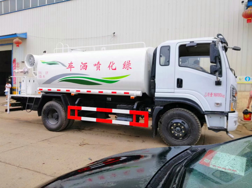 12吨洒水车上装配置:整车具有前冲、后洒、侧喷(更换喷头后变为侧花洒)、后置式工作平台(带踏梯,四周有安全护栏)、平台上设置有高压水炮(可360°全方位旋转,水流可调成柱状,射程28米;也可调成雾状,射程14米,可连续喷射出:直冲状、大雨、中雨、小雨、毛毛雨)。该车洒水宽度大于14米,配备优质大功率专用洒水泵、取力器、杂物过滤网、国标通用65型消防接口(可通过消防栓加水)、1套自流球阀系统(可自吸自排,吸程6米)、2根引水钢丝胶管(带阴阳快速接头)、配锁、水位计、高音作业喇叭,两侧及后加强型保险杠,防滑爬梯,胶管储存筒。