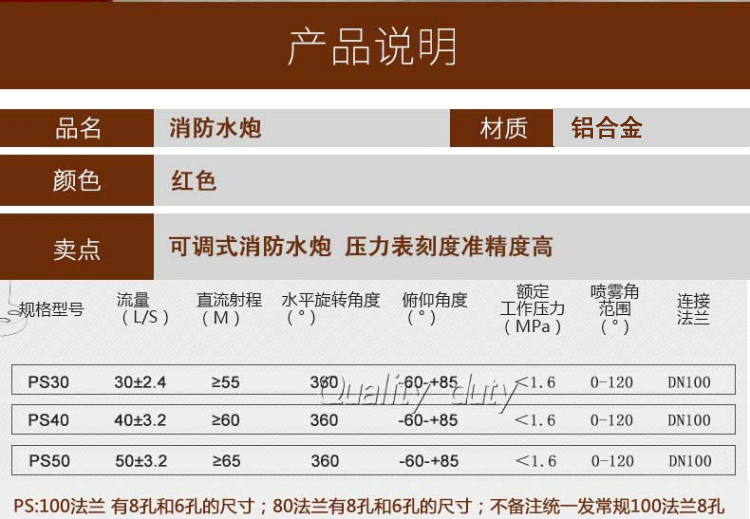 洒水车洒水炮的组成 洒水车洒水炮由五部分组成:炮头、炮杆、水炮三通、法兰,手柄。使用方法:用户在使用时只需要打开管路阀门,调节水炮到所需要的喷洒状态,站在洒水车的操作平台上握住手柄,就可以轻松便捷的操作了。洒水车洒水炮适用范围:广泛用于东风140洒水车,东风145洒水车,东风153洒水车,东风天龙前四后八洒水车等各种洒水车。洒水炮性能:360旋转,方向可旋转,可调节到任意角度,可根据用户要求上下左右自由调节。射程可达20-28m.可调节成水柱状,大雨、中雨、毛毛雨、雾状。