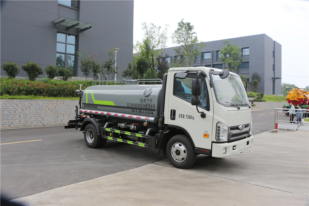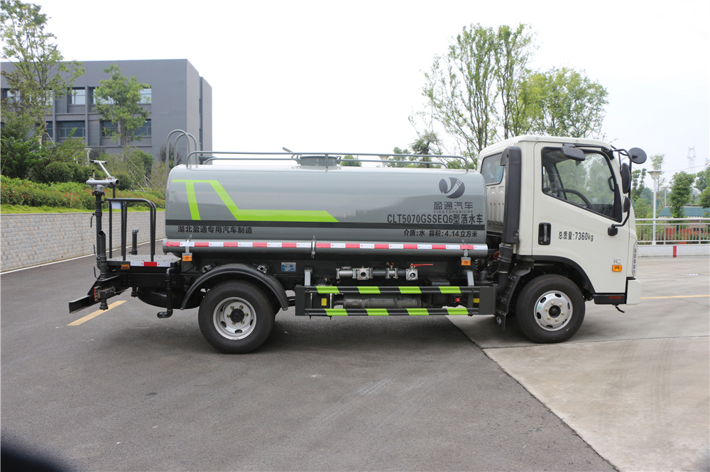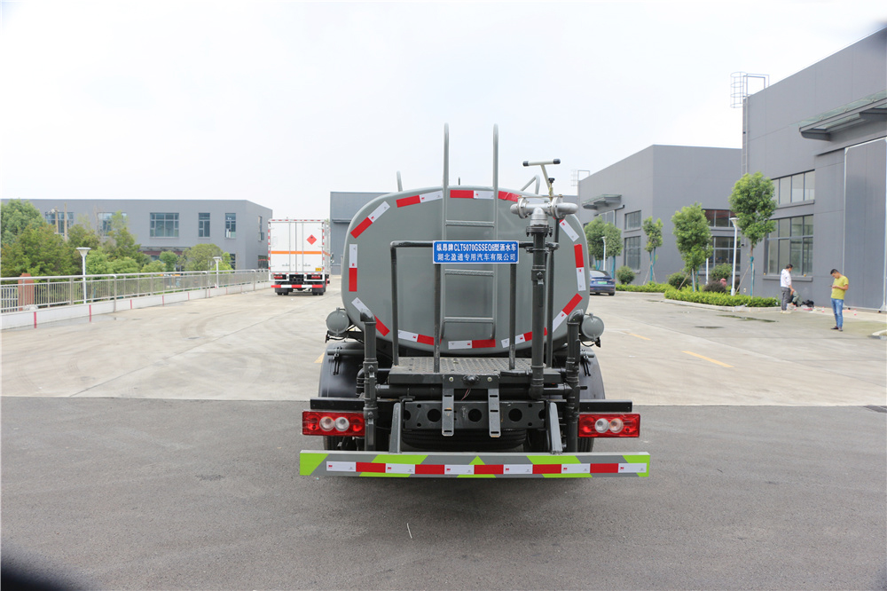 专用功能配置:罐体实际容积为5立方米,采用武钢优质碳钢板卷压成型。配备专用洒水泵,自吸自排,前喷后洒、侧喷、后工作平台及洒水高压炮。洒水泵自吸高度为6米左右,整车洒水宽度14米左右,后工作平台水炮可调成:直冲状、大雨、中雨、小雨、毛毛雨,有效射程≥28米,整车带接头、水位计,自流阀及自吸功能。后工作平台主管道带1寸浇花接口,附送2根3米水管,1个爬梯,两侧及后保险杠。