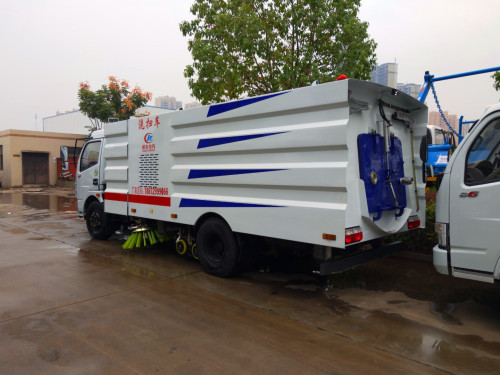 新款东风大多利卡洗扫车采用东风底盘,型号:EQ1090SJ8BDE二类汽车底盘改装,轴距4400mm,加装副发动机、风机、高压水泵、清水箱、垃圾箱、左右立扫、带喷水杆的宽吸嘴、低压冲洗系统、扫盘降尘系统、液压系统、专用装置电控系统和副车架等改装而成。副发动机驱动风机和高压水泵,副发动采用东风康明期6缸柴油发动机,排放达国Ⅰ或国Ⅱ标准。风机用 6.8高压离心风机,效率高、风量大,风量达23500m3/h。高压水泵采用同际知名的意大利Pratissoli 型柱塞柱,不锈钢泵头,流量合适,压力高,允许压力达16-20MPa,清水箱充分利用了车载空间,容积大,容积达5m3。垃圾箱采用内外双层不锈钢结构,倾翻卸料,带高液位报警保护装置和自洁装置,垃圾箱容积4m3。 自洁装置可在垃圾箱卸料时帮助卸料,清洗垃圾箱内部。左右立扫为单扫盘,减少了扫刷数量和扫刷消耗量,能降低使用成本。左右立扫分开控制,可实现左、右全扫等作业模式。宽吸嘴的吸口宽度达到2418mm,确保作业总宽度大于3.5mm。4个高度可调的吸嘴轮,能方面调整和保证吸嘴与路面间的合理间隙。吸嘴内高有喷水杆,尽可能多地将高压洗涤喷嘴布置在吸嘴内部,不但清洗效果好,还能限度减少高压水气流冲起污物产生的二次污染。左右喷水杆安装在吸嘴上,随吸嘴升降,结构简单紧凑,保证喷水杆的离地高度固定不变,达到清洗效果。开式液压系统驱动左右立扫升降、左右扫盘旋转、吸嘴升降、垃圾箱后门开闭、垃圾箱倾翻复位等机械动作。底盘变速箱侧取力器驱动低压水泵,实现洒水车的低压冲洗功能。专用工作装置电控系统采用PLC智能化控制,一键式作业起动和停机操作。