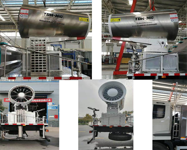 专用装置为抑尘雾炮,用于城市抑尘.整车长/前悬/轴距/后悬对应关系(mm)为:/3000(2800)). 侧面防护材料:Q235A碳钢.连接方式:左右侧面采用螺栓连接.后防护装置材料:Q235A碳钢. 连接方式:采用螺栓连接.后部防护断面尺寸(mm):120×45,后部防护离地高度(mm):450.装备ABS, ABS型号及生产厂家为:3631010-C2000/东科克诺尔商用车制动系统(十堰)有限公司,J ABS/焦作博瑞克 控制技术有限公司.随底盘选装驾驶室.选装底盘部件安装位置.选装不同的雾炮样式. |