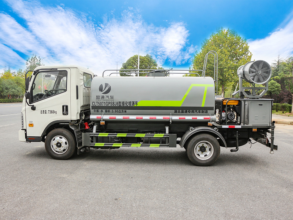 福田 H2 蓝牌 5 方抑尘车-洒水车产品产品配置 1.底盘配置: 福田 H2 驾驶室,发动机全柴 115 马力,万里扬 5 档变速箱, 7.00R16 钢丝胎,3360 轴距,中控锁,电动玻璃,T-BOX(全国通用), 5T 后桥,断气刹,ABS2.上装配置: 1、罐体约为 5 方,可加装 30 型雾炮 2、边灯带电,罐体尾部上方标配 2 个红色示宽灯, 3、标配前喷为鸭嘴直冲,标配后冲,用户可根据自己的需求,来调 整对冲位置。 4、花纹防滑平台,炮筒后盖为定制型螺栓卡扣, 5、前喷、后冲、后洒、侧喷,绿化高炮开关球阀均采用 50 大通经 不锈钢球阀, 6、新式轴承式水炮,更加耐用, 7、40-50 型水泵, 8、防腐法兰垫片, 9、铝制后洒,不易炸开 10、罐体自动焊(美国林肯焊机及电源),拼板自动焊接,封头环 缝焊接,无气孔,焊缝美观。 11、侧护网、后保险杠、均为螺栓连接,方便拆卸,维修方便。 12、塑料挡泥板,替代铁挡泥板,更加轻便,用螺栓连接,方便拆 卸。 13、前部、后部主管连接处为 6 孔圆法兰,不易冲垫
