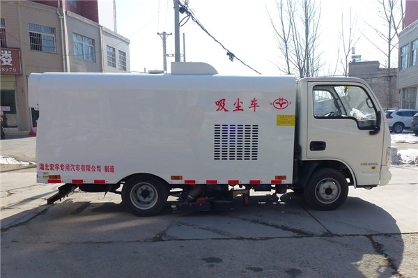 该吸尘车是采用跃进型国五二类原厂汽车底盘改装,加装副发动机、风机、清水箱、垃圾箱、中置吸盘,工作视频探头,自动脉冲清理功能,液压系统、专用装置电控系统和副车架等改装而成。