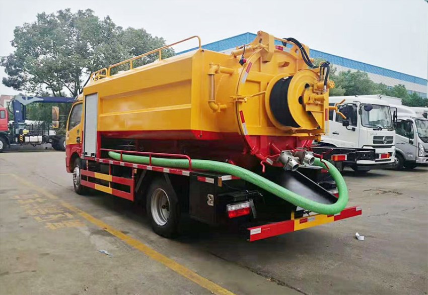 东风大多利卡D7新款驾驶室,底盘型号:EQ1110SJ8BDC 广西玉柴150马力涡轮增压,5.5吨后桥,8.25R16钢丝胎,双层大梁,断气刹,带空调 ,ABS,6档变速箱。吸污罐:7立方,罐体6毫米碳钢,吸污部分:配SK-9水循环泵,(选装SK-12水循环泵)进气管加过滤网,防溢阀加高,两根8米吸污管,后盖4个卡扣锁紧,后视粪窗,后部150mm的球阀和100mm的球阀均带出口,吸污罐体和清洗罐体外互通。右后边150mm排污口带球阀。清洗水罐3立方,4毫米碳钢,右侧消防进水,气控推水,带过滤网,采用天津通洁高压清洗泵,24兆帕,170升流量,选装215L流量,22兆帕高压泵,标配60米内径19#高压管,组合喷头一套,罐体两边为平台,后背700mm高压清洗卷盘,后部左右后一个示宽灯,整车工程黄, 其它标准配置。