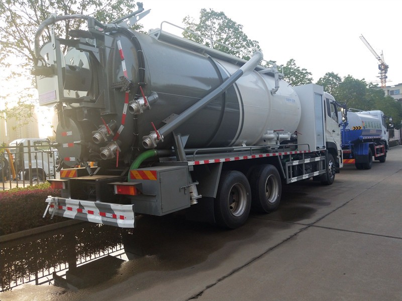 由于吸粪胶管始终浸没于液面上,粪罐内的空气被抽吸后,因其得不到补充而越来越稀薄,致使罐内压力低于大气压力,粪液即在大气压力使用下,经吸粪胶管进入容罐。或者由于虹吸管接近罐底,空气被不断排入粪罐时,因其没有出路而被压缩,致使罐内压力高于大气压力,粪液即在压缩空气的作用下,经虹吸管,吸粪胶管排出罐外。吸污车主要用于清洗城市下水道,管道的沉积物,死角泥沟的疏通,也可用于清洗工业排液管道,壁面等,并可兼作洒水,运水和冲公路用,紧急时可用于救火。