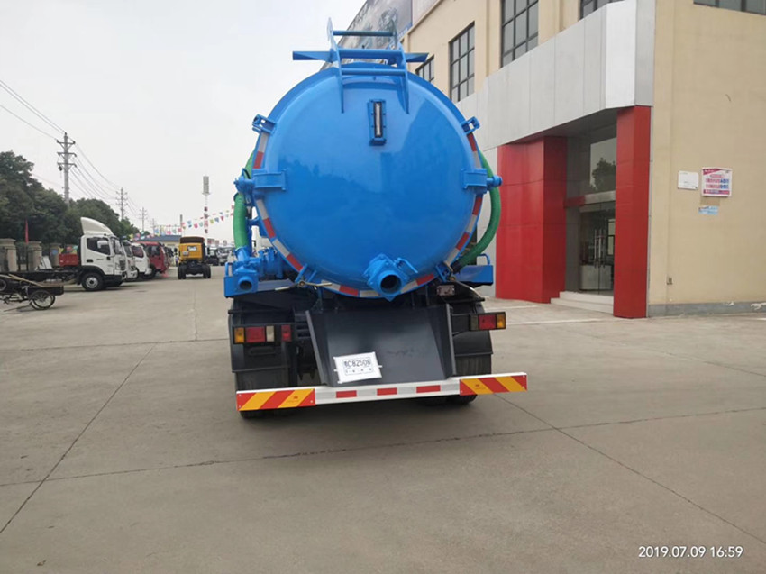 福田8吨吸污车该车用途为吸污,主要装置为污罐;罐体有效容积:7.28立方米,运输品名:液态污物,罐体尺寸(mm): 直段长4100,直径1500;防护材料:Q235A碳钢 ,连接方式:左右侧面及后下部防护均采用焊接连接,后部防护断面尺寸(mm):150×50,后部防护离地高度(mm):480. 整车长/轴距对应关系为(mm):6950/3800,7350/4200;ABS控制方式为4S/4M,ABS型号为CM4XL-4S/4M, 生产厂家为广州瑞立科密汽车电子股份有限公司;选装车辆后部图片. |