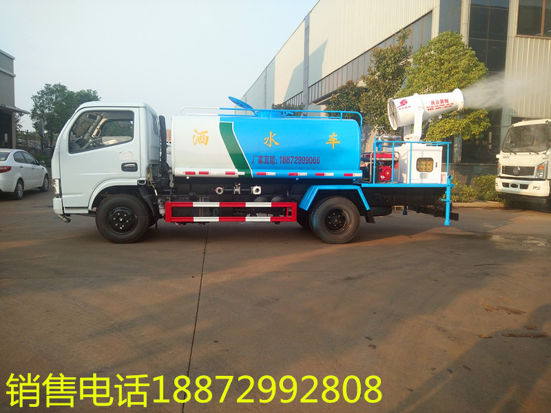 随底盘选装驾驶室;品名:水,密度:1000千克/立方米,有效容积4.09立方米,罐体尺寸(长×宽×高)(mm):3400×1600×1100;ABS吸程≧7米,洒水宽度≧14-16米,射程≧25-30米,引水时间<5min,流量60m3/h。前冲(喷)、后洒、带侧喷(花洒)、带后工作平台、平台上安装绿化洒水高炮(炮喷射形状可调节:直冲、大雨、中雨、毛毛雨、雾状、可连续调节,360°旋转),配消防接口,自流阀,滤网,带自吸自排功能。配备大功率专用洒水泵,泵可自吸自排,安装过滤网,带消防接口,可通过消防栓进水,带自流阀,随车选装20米绿化卷盘,可喷洒农药,罐体金属漆。罐体有椭圆和方圆罐两种,可根据用户的要求定做 发动机可选,云内,朝柴 ,锡柴,全柴