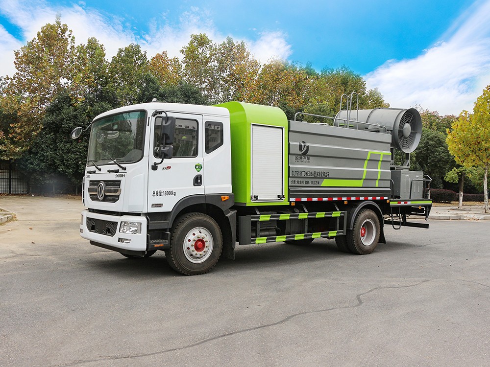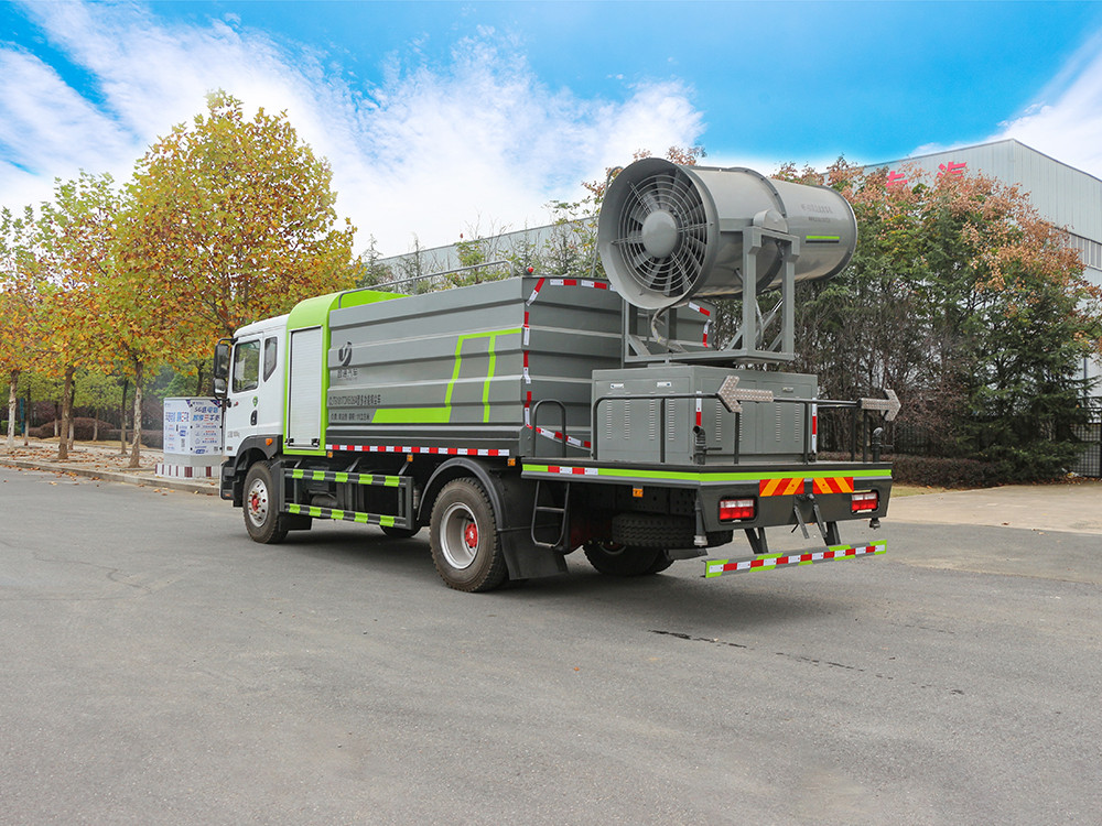 东风D9 -12方大型抑尘车产品配置 1.底盘配置: 发动机玉柴 200 马力(四缸),法士特 8 档变速箱,2315 驾驶 室,4.5T 前桥,10T 后桥,10.00R20 钢丝胎,轴距 4500,250 双层大 梁,断气刹,空调,电动玻璃,中控锁2.上装配置: 1、罐体约为 12 方,可加装 50-80 型雾炮 2、边灯带电,罐体尾部上方标配 2 个红色示宽灯, 3、标配前喷为鸭嘴直冲,标配后冲,用户可根据自己的需求,来调 整对冲位置。 4、花纹防滑平台,炮筒后盖为定制型螺栓卡扣, 5、前喷、后冲、后洒、侧喷,绿化高炮开关球阀均采用 50 大通经 不锈钢球阀, 6、新式轴承式水炮,更加耐用, 7、60-90 型水泵, 8、防腐法兰垫片, 9、铝制后洒,不易炸开 10、罐体自动焊(美国林肯焊机及电源),拼板自动焊接,封头环 缝焊接,无气孔,焊缝美观。 11、侧护网、后保险杠、均为螺栓连接,方便拆卸,维修方便。 12、塑料挡泥板,替代铁挡泥板,更加轻便,用螺栓连接,方便拆 卸。 13、前部、后部主管连接处为 6 孔圆法兰,不易冲垫