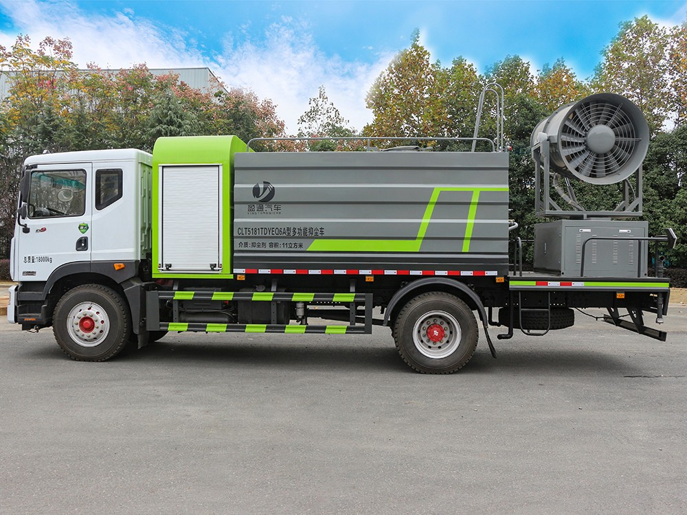 东风D9 -12方大型抑尘车产品主要技术参数 序号 名称 型号、规格 1 整车型号 CLT5181TDYEQ6A 型多功能抑尘车 2 发动机型号 YCS04200-68 3 发动机马力/功率 玉柴 200 马力/147KW 4 发动机排量 4156ML 5 变速箱 法士特 8 档(带高低档) 6 轮胎规格 10.00 钢丝胎 7 轴距 4500 8 总质量 18000KG 9 整备质量 8900KG 10 额定载质量 8905KG 11 整车尺寸(长×宽×高) 8.68*2.5*3.8 12 罐体容积 12 方 13 燃料种类 柴油 14 排放标准 国六 15 水泵型号 60/90 16 罐体材质 Q235 碳钢