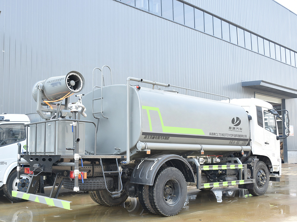 东风天锦12方抑尘车产品配置 1.底盘配置: 发动机康明斯 230 马力(六缸),法士特 8 档变速箱,D530 排 半标准顶,4.5T 前桥,9T 后桥 10.00 钢丝胎,轴距 4700,断气刹, 空调,电动玻璃。2.上装配置: 1、罐体约为 12 方,可加装 30-40 型雾炮 2、边灯带电,罐体尾部上方标配 2 个红色示宽灯, 3、标配前喷为鸭嘴直冲,标配后冲,用户可根据自己的需求,来调 整对冲位置。 4、花纹防滑平台,炮筒后盖为定制型螺栓卡扣, 5、前喷、后冲、后洒、侧喷,绿化高炮开关球阀均采用 50 大通经 不锈钢球阀, 6、新式轴承式水炮,更加耐用, 7、60-90 型水泵, 8、防腐法兰垫片, 9、铝制后洒,不易炸开 10、罐体自动焊(美国林肯焊机及电源),拼板自动焊接,封头环 缝焊接,无气孔,焊缝美观。 11、侧护网、后保险杠、均为螺栓连接,方便拆卸,维修方便。 12、塑料挡泥板,替代铁挡泥板,更加轻便,用螺栓连接,方便拆 卸。 13、前部、后部主管连接处为 6 孔圆法兰,不易冲垫