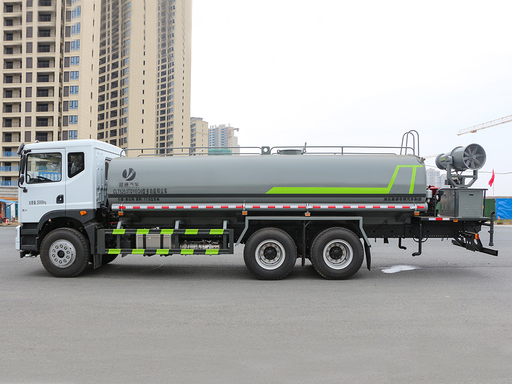 东风华神T5 -20方抑尘车-大型雾炮车产品主要技术参数 序号 名称 型号、规格 1 整车型号 CLT5253TDYEQ6 型多功能抑尘车 2 发动机型号 B6.2NS6B260 3 发动机马力/功率 康明斯 260 马力/191KW 4 发动机排量 6200ML 5 变速箱 法士特 8 档(带高低档) 6 轮胎规格 11.00 钢丝胎 7 轴距 4350+1350 8 总质量 25000KG 9 整备质量 11400KG 10 额定载质量 13405KG 11 整车尺寸(长×宽×高) 10.45*2.51*3.2 12 罐体容积 20 方 13 燃料种类 柴油 14 排放标准 国六 15 水泵型号 60/90 16 罐体材质 Q235 碳钢