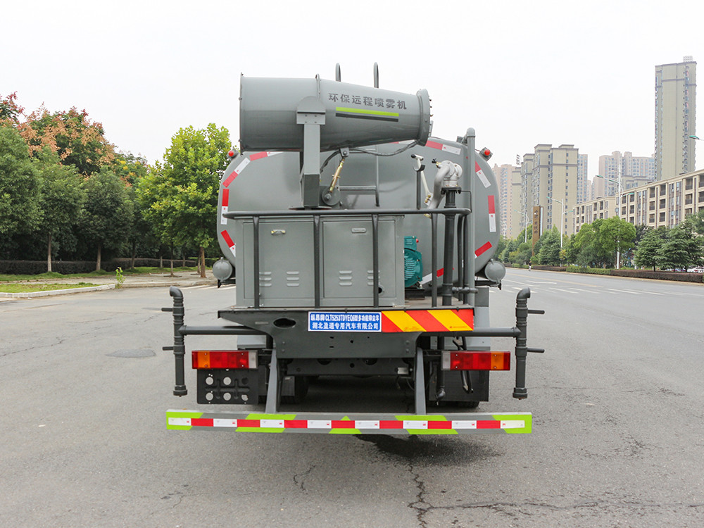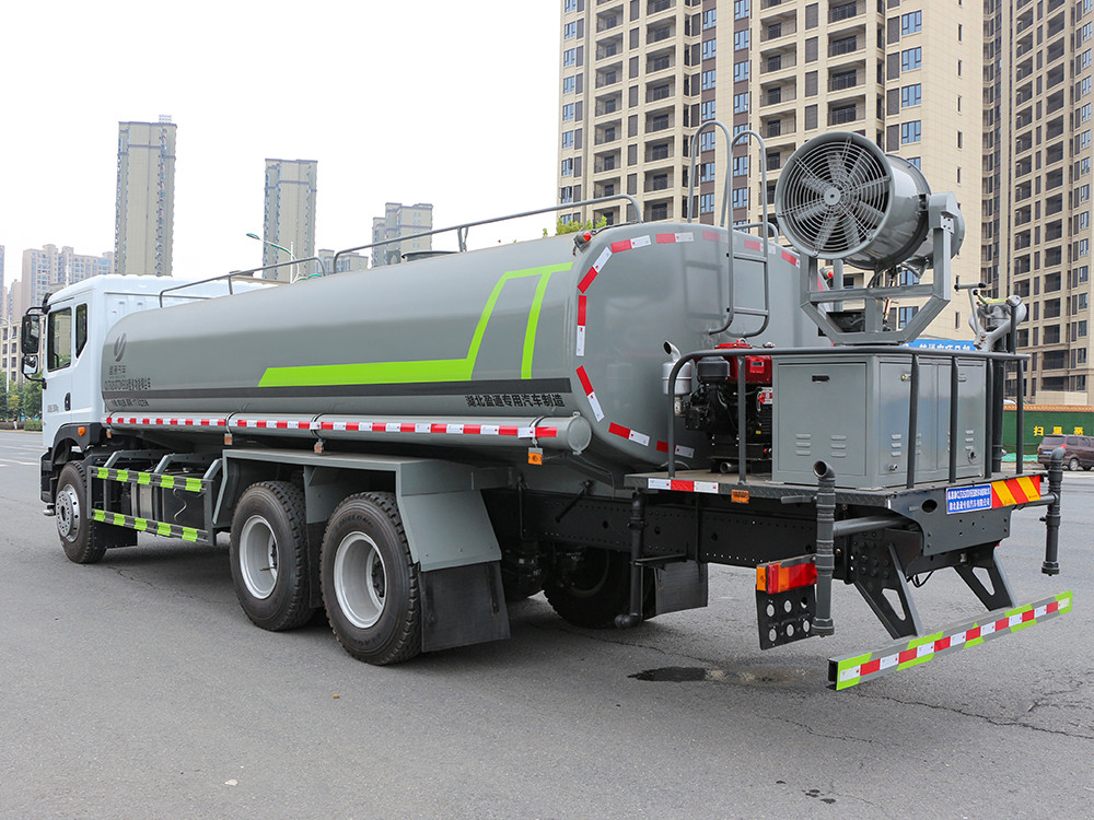 东风华神T5 -20方抑尘车-大型雾炮车产品配置 1.底盘配置: 发动机康明斯 260 马力(六缸),法士特 8 档变速箱,前桥 5 吨,双 10 吨后桥,11.00 钢丝胎,轴距 4350+1350,断气刹,ABS,空 调,气囊座椅,电动玻璃,中控锁。多功能方向盘。2.上装配置: 1、罐体约为 20 方,可加装 30-40 型雾炮 2、边灯带电,罐体尾部上方标配 2 个红色示宽灯, 3、标配前喷为鸭嘴直冲,标配后冲,用户可根据自己的需求,来调 整对冲位置。 4、花纹防滑平台,炮筒后盖为定制型螺栓卡扣, 5、前喷、后冲、后洒、侧喷,绿化高炮开关球阀均采用 50 大通经 不锈钢球阀, 6、新式轴承式水炮,更加耐用, 7、60-90 型水泵, 8、防腐法兰垫片, 9、铝制后洒,不易炸开 10、罐体自动焊(美国林肯焊机及电源),拼板自动焊接,封头环 缝焊接,无气孔,焊缝美观。 11、侧护网、后保险杠、均为螺栓连接,方便拆卸,维修方便。 12、塑料挡泥板,替代铁挡泥板,更加轻便,用螺栓连接,方便拆 卸。 13、前部、后部主管连接处为 6 孔圆法兰,不易冲垫
