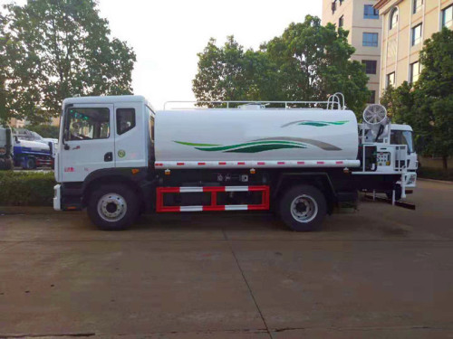 罐体采用4mm厚碳钢板制作,罐体容积10吨,配备大功率专用洒水泵。前冲(喷)后洒,带侧喷,后置工作平台,平台上安装绿化洒水高压炮(炮喷射形状可调成直冲状、大雨、中雨、毛毛雨、炮可360度旋转,射程≧25米)。带自流阀,消防接口。带自吸泵,可抽水或从消防栓上连接注水。