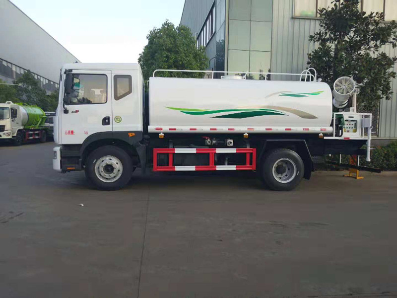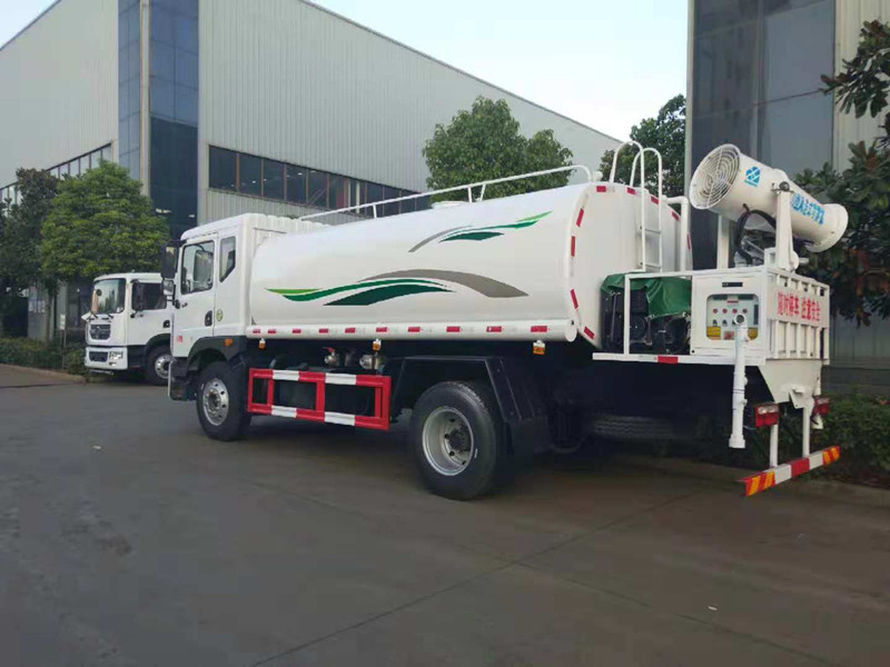 东风多利卡D9喷雾抑尘洒水车_抑尘车多少钱一辆;我公司生产的东风多利卡D9喷雾抑尘洒水车下线检测了。车款车型选用东风多利卡D9系列单桥底盘,3950mm轴距,新款排半驾驶室,康明斯ISB180 50六缸发动机,国五排放,250mm车架,气制动,动力转向,离合助力,空调,电动窗,中控锁,ABS,8吨后桥,4吨前桥,东风六档变速箱,9.00R20钢丝胎。选配30米喷雾抑尘机。罐体用5MM碳钢板制作,罐内隔板具有防波作用,以减低汽车行驶时罐体液体的冲击。整车带一个专用洒水泵(垂直吸程6米),洒水宽度14米,射程28米。多功能洒水车配备2个前冲(喷)(能将路面泥巴、尘土、垃圾冲干净);2个后洒(能均匀地将水洒在路面,一次洒水宽度14米)、2个侧喷(花洒)(能均匀地将路旁绿化带浇灌)、带1个后工作平台,平台上安装1个绿化洒水高炮(洒水炮可全方位旋转,可连续调成直冲状、大雨、小雨、毛毛雨,雾状可调节冲洗高大树木),引水时间<5min,流量90m3/h。带1个消防接头,带1个自流阀,1个过滤装置、人性化爬梯及侧防护栏,安装洒水音乐喇叭。