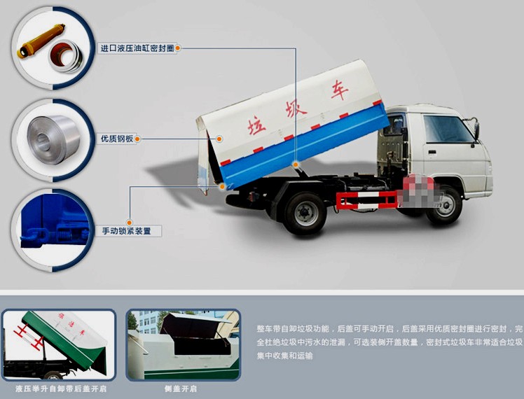 密封式垃圾车又称自卸式垃圾车,主要由汽车底盘、箱体、开门机构、举升机构、电液控制系统等组成,是一种新型机、电、液一体化的全密封结构垃圾运输车辆,它不但可与LSY系列垃圾站配套使用,也可广泛用于城镇居民生活区、工业区、商业区、学校、公园、风景区等场所的垃圾运输工作